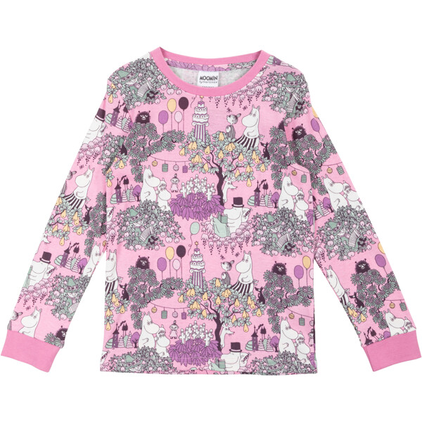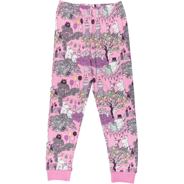 Ein zweiteiliger Mumin-Pyjama für Kinder. Mit langen Ärmeln und rundem Halsausschnitt. Die Hose hat einen eingearbeiteten Gummizug in der Taille und Bündchen an den Beinabschlüssen. Hergestellt aus weicher und gemütlicher Baumwolle.