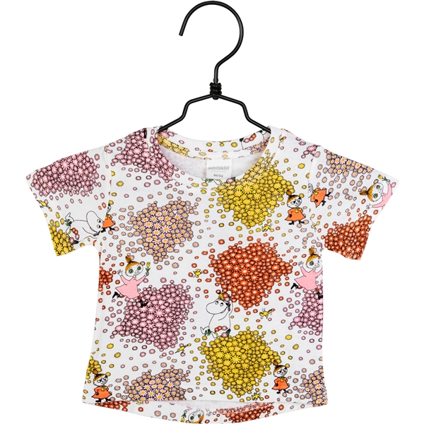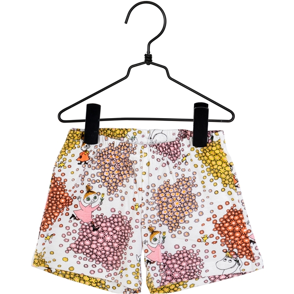 Ein zweiteiliger Pyjama in Elfenbeinweiß, komplett gemustert mit Snorkfräulein, Klein-My und Mymla zwischen schönen Blumenakzenten in Lila, Gold und Kupfer. Das kurzärmelige Oberteil hat ein leicht ausgestelltes Design mit einem schön gerundeten, längeren Rückenteil. Die Shorts haben kurze Beine und einen eingearbeiteten Gummizug in der Taille.