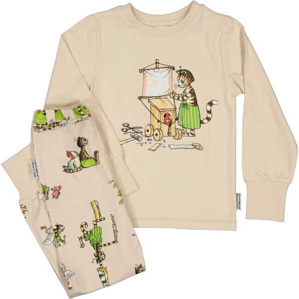 Pyjama Pettson & Findus Beige ist ein zweiteiliger Pyjama aus weicher und angenehmer Bio-Baumwolle.