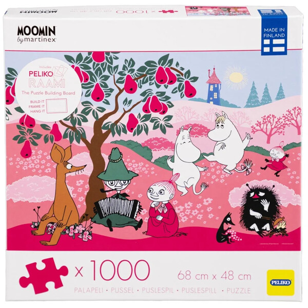 Ein 1000-teiliges Puzzle von Peliko, mit einem schönen Mumin-Motiv in feinen Rosatönen. Die Mumins und ihre Freunde genießen einen gemütlichen Musikmoment unter dem Birnbaum.