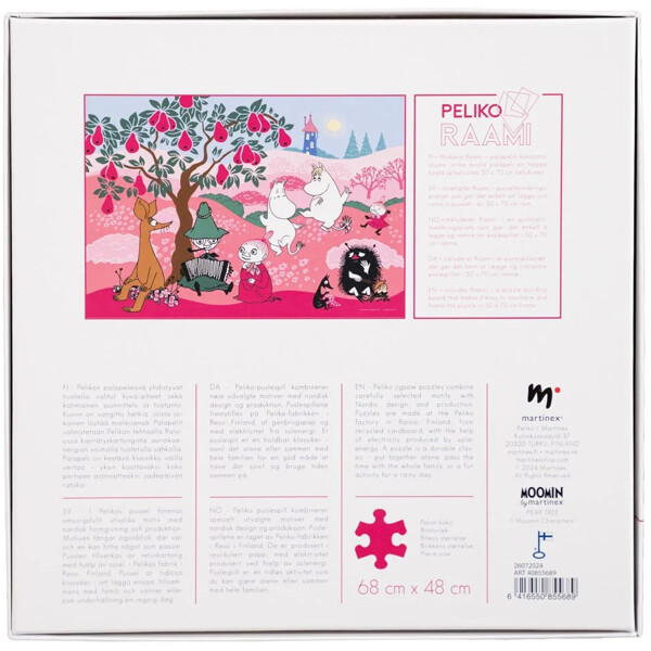 Die Größe des gelegten Puzzles beträgt 68 x 48 cm. Pelikos Puzzles werden in Finnland aus Recyclingkarton und mit Hilfe von Solarstrom hergestellt.