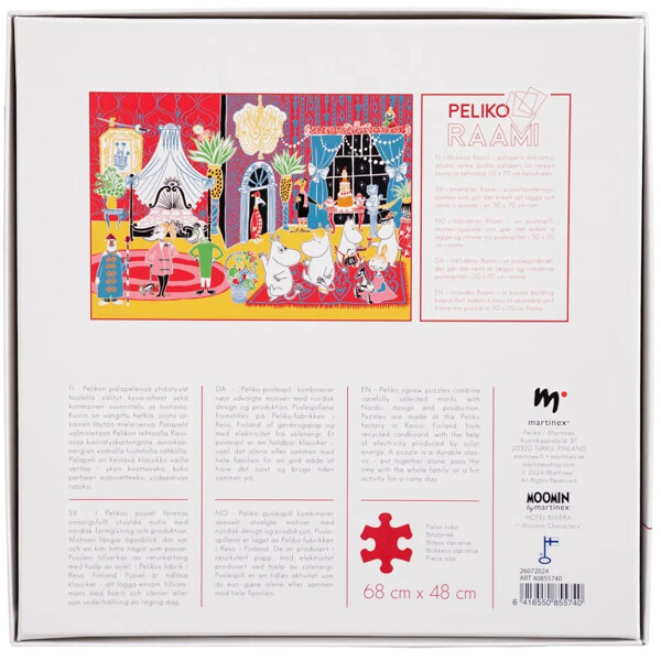 Die Größe des gelegten Puzzles beträgt 68 x 48 cm. Pelikos Puzzles werden in Finnland aus Recyclingkarton und mit Hilfe von Solarstrom hergestellt.