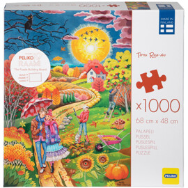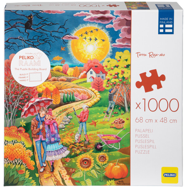 Ein Puzzle mit 1000 Teilen und einem romantischen und detaillierten Motiv in den schönen Herbstfarben, geschaffen von der finnischen Künstlerin Terttu Raja-aho. Ein gemütlicher Herbstspaziergang zusammen zwischen den Apfelbäumen, auf der gewundenen Route über Hügel und Wiesen.