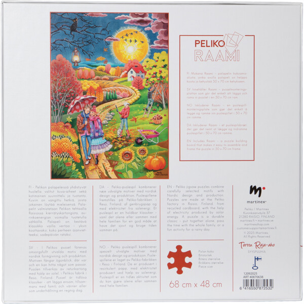 Enthält die Puzzleunterlage Peliko Raami, die es einfach macht, das Bild zu bauen und in einem Standardrahmen von 50 x 70 cm einzurahmen.