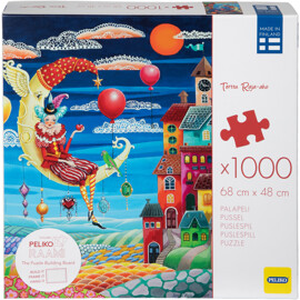 Ein Puzzle mit 1000 Teilen und einem charmanten und detaillierten Motiv in klaren Farben, geschaffen von der finnischen Künstlerin Terttu Raja-aho. Der schlaflose Clown sitzt auf dem Mond, baumelt mit den Beinen und hält einen Apfel in der Hand.