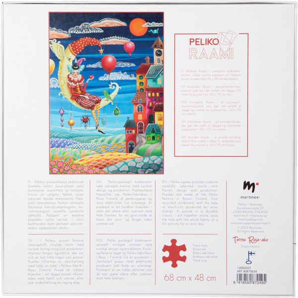 Enthält die Puzzleunterlage Peliko Raami, die es einfach macht, das Bild zu bauen und in einem Standardrahmen von 50 x 70 cm einzurahmen.