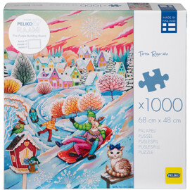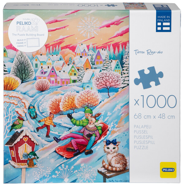 Ein Puzzle mit 1000 Teilen und einem spannenden, lustigen und detaillierten Motiv in den kälteren Farbtönen des Winters, geschaffen von der finnischen Künstlerin Terttu Raja-aho. Winterfreude für sowohl Tiere als auch Menschen, mit einer von glitzerndem Schnee bedeckten Landschaft.