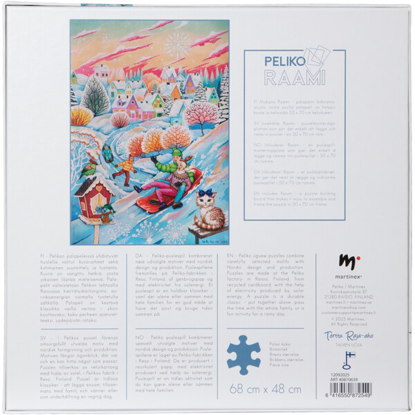 Enthält die Puzzleunterlage Peliko Raami, die es einfach macht, das Bild zu bauen und in einem Standardrahmen von 50 x 70 cm einzurahmen.