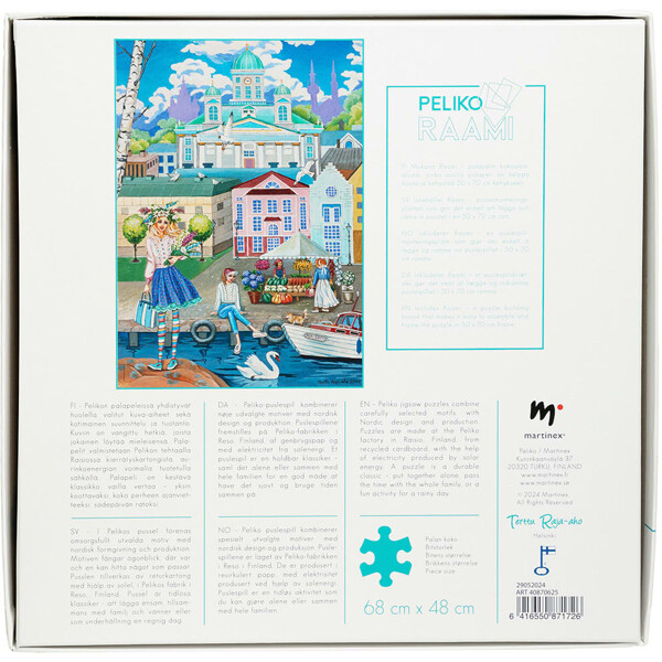 Das Motiv zeigt unter anderem die prächtige Kathedrale, das Parlamentsgebäude, Stadtbewohner am Steg, Marktplätze und Vögel. Peliko-Puzzles werden in Finnland aus Recyclingkarton und mit Hilfe von Solarstrom hergestellt. Die Größe des fertigen Puzzles beträgt 68 x 48 cm.
