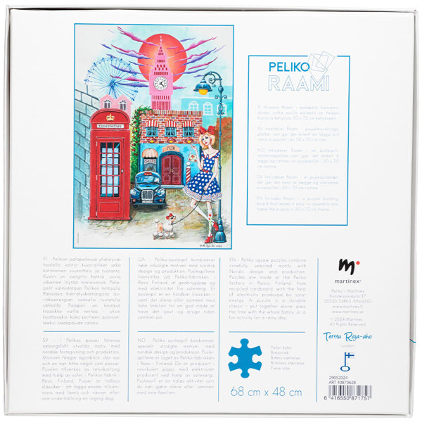 Enthält Peliko Raami, eine Puzzle-Montageplatte, die das Puzzeln erleichtert und das Puzzle in einem Rahmen in Standardgröße 50 x 70 cm einrahmen lässt.