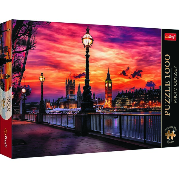 Puzzle 1000 Teile Trefl Big Ben ist ein schönes Motiv, das die Themse darstellt. Im Hintergrund sind Big Ben und der Westminster Palace bei Sonnenuntergang zu sehen.
