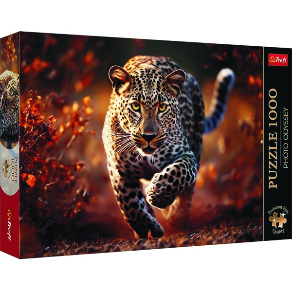 Puzzle 1000 Teile Trefl Wild Leopard zeigt einen majestätischen Leoparden im Sprung.