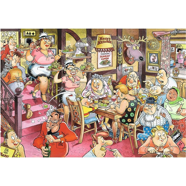 Wasgij Retro Mystery 5 Sunday Lunch! heißt Sie in dem Restaurant willkommen, in dem ein köstliches Sonntagsessen serviert wird. In diesem Restaurant passiert viel gleichzeitig, und das kleine Kind auf dem Stuhl wirft etwas hinter seinen Kopf und sieht nicht glücklich aus. Was glauben Sie, passiert als Nächstes? Nutzen Sie Ihre Fantasie und puzzeln Sie, was Sie denken, als Nächstes geschehen wird.