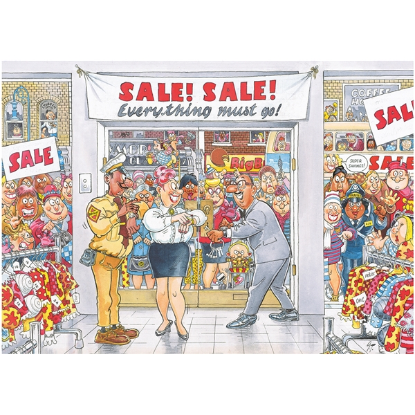 Der Sicherheitsbeamte und die Kassiererin schauen auf ihre Uhren, während der Chef den Schlüssel im Schloss dreht und die Horde von Einkäufern mit offenen Augen und Mündern auf all die fantastischen Angebote starrt. Aber ist dieser Laden auf den "Alles muss raus"-Ausverkauf vorbereitet? Das ist die Szene, die du puzzeln sollst, was als Nächstes passiert.
