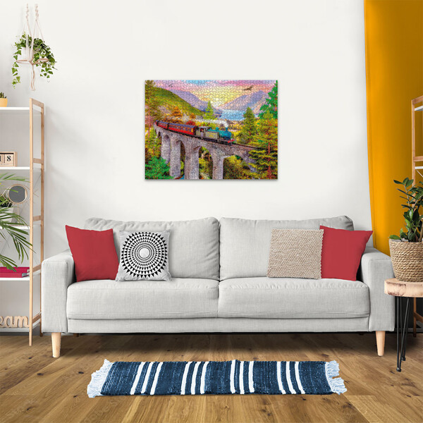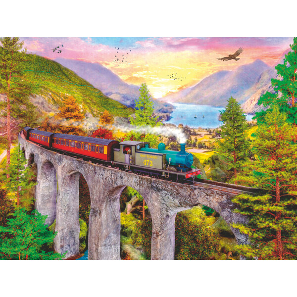 Puzzle 1500 Teile Autumn Viaduct zeigt ein wunderschönes Motiv eines Zuges, der über eine hohe Brücke durch eine Herbstlandschaft fährt.