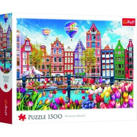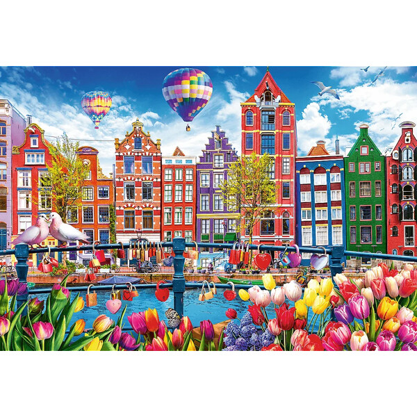 Das farbenfrohe Amsterdam-Puzzle besteht aus 1.500 Teilen und zeigt ein lebhaftes Panorama der Amsterdamer Grachtenhäuser, umgeben von Tulpen, Ballons und Dekorationen, was eine freudige und traumhafte Stadtlandschaft schafft.