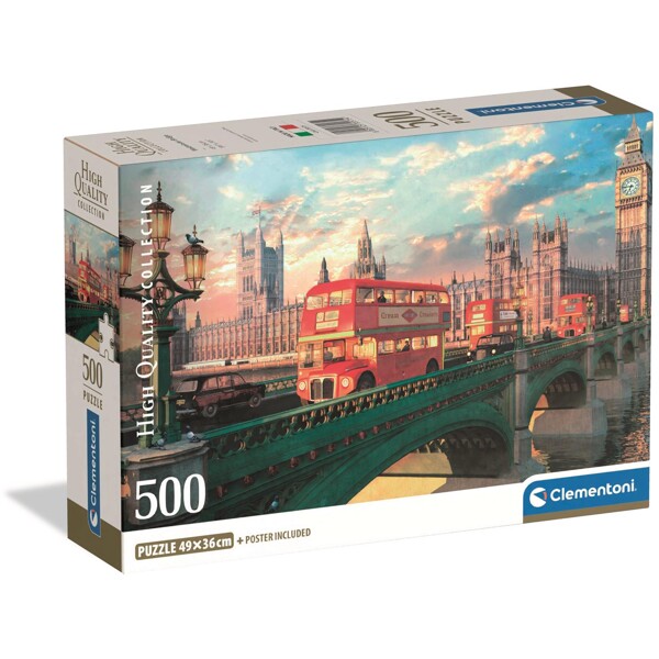 Puzzle 500 Teile CB Westminster Bridge zeigt einen klassischen Blick auf London mit den roten Bussen und Big Ben.