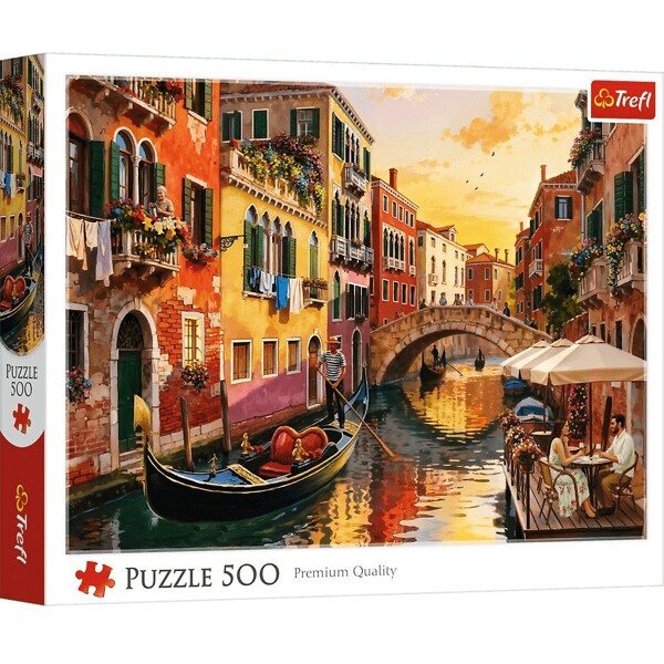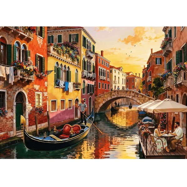 Dieses Puzzle mit 500 Teilen zeigt eine romantische venezianische Kanalgasse, in der Gondeln im warmen Licht der untergehenden Sonne zwischen bunten Reihenhäusern und stimmungsvollen Café-Tischen schweben.