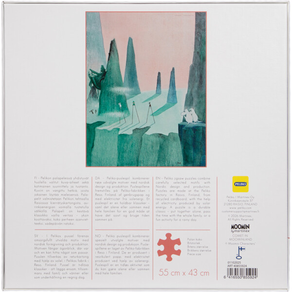 Dieses Puzzle mit 750 Teilen zeigt ein Motiv der Künstlerin und Autorin Tove Jansson. Das Bild ist ihre bezaubernde Illustration aus dem zweiten Mumin-Buch "Komet im Mumintal", das im Jahr 1946 veröffentlicht wurde.