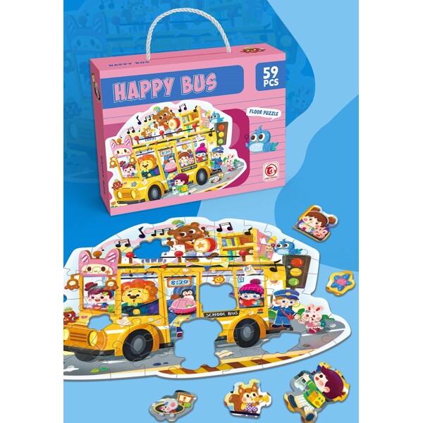 Ein lustiges Bodenpuzzle in Form eines Schulbusses mit vielen Details und niedlichen Figuren.