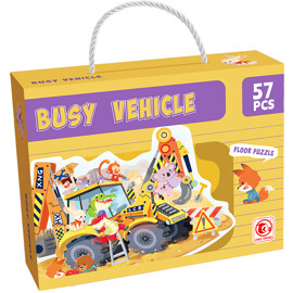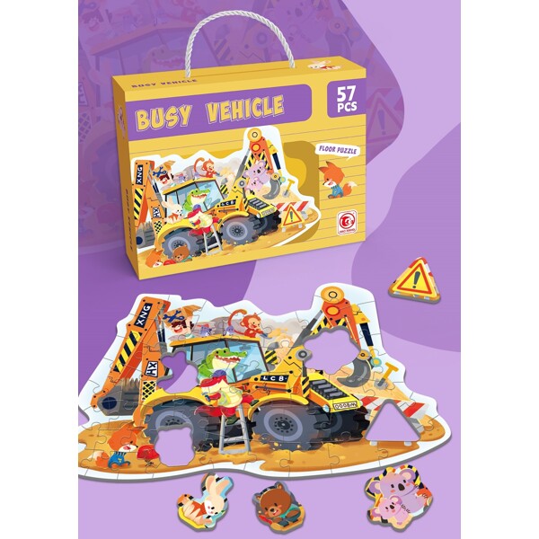 Ein niedliches Bodenpuzzle mit Arbeitsfahrzeugen und süßen Tieren.
