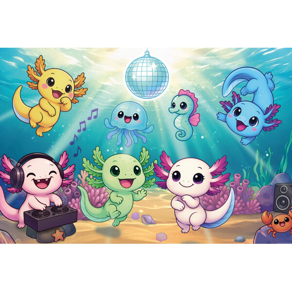 Puzzle 100 Teile Axolotl ist ein schönes Motiv mit tanzenden Axolotln auf dem Meeresboden.