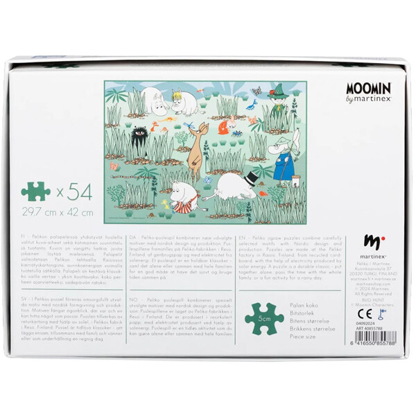 Ein 54-teiliges Puzzle von Peliko mit einem lustigen Mumins-Motiv, bei dem die Mumins mit Freunden im Gras nach kleinen Krabbeltieren suchen.