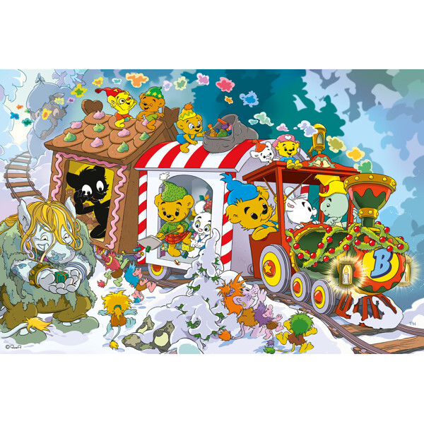 Puzzle Kärnan 100 Teile Bamse Weihnachten ist ein hochwertiges Puzzle mit einem schönen Bamse-Weihnachtsmotiv. Lege das Puzzle und sieh, wie der Süßigkeitenzug langsam entsteht.