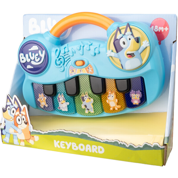 Hol das Klavier heraus und tritt Blueys Band bei. Die Tasten des Bluey-Spielzeugklaviers leuchten und sind mit Bildern bekannter Hundefiguren verziert. Das Klavier hat einen Griff, der es leicht macht, es mitzunehmen.
