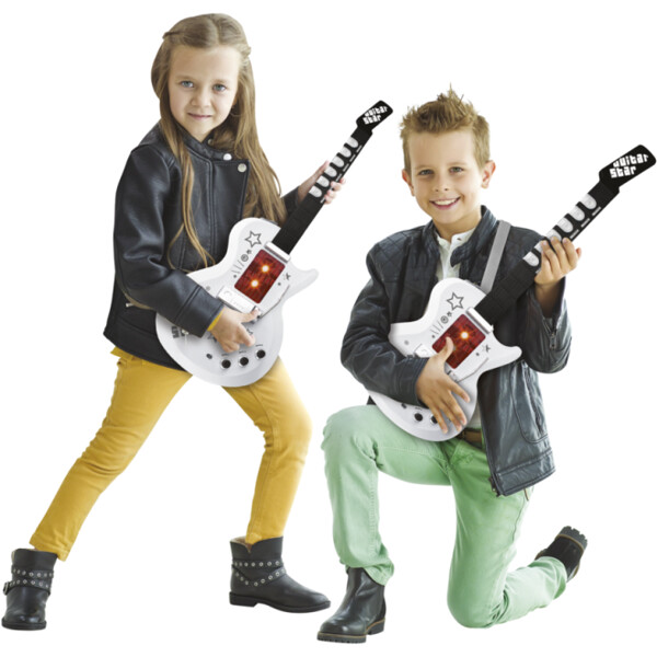 Die Gitarre hat 6 Saiten, eine Whammy-Bar und bietet dir 3 verschiedene Spielmöglichkeiten. Sie kommt mit 6 eingebauten Nummern, sodass du von Anfang an glänzen kannst. Ein Schultergurt ist im Lieferumfang enthalten.