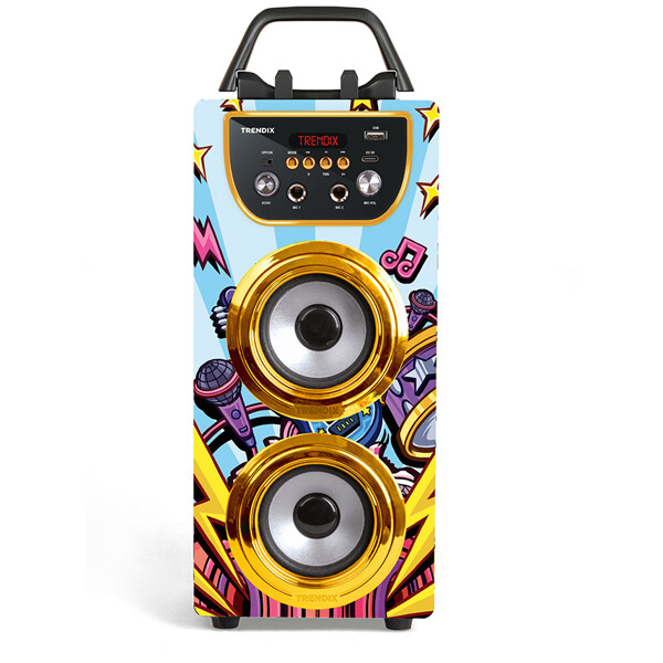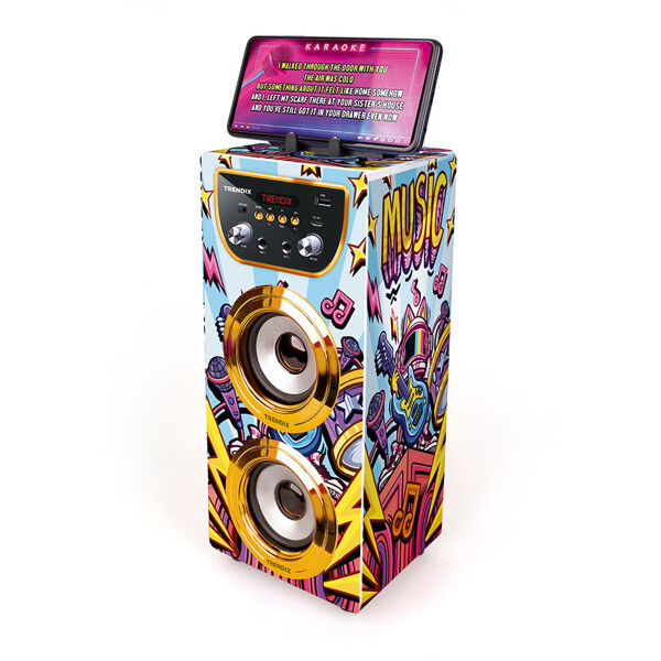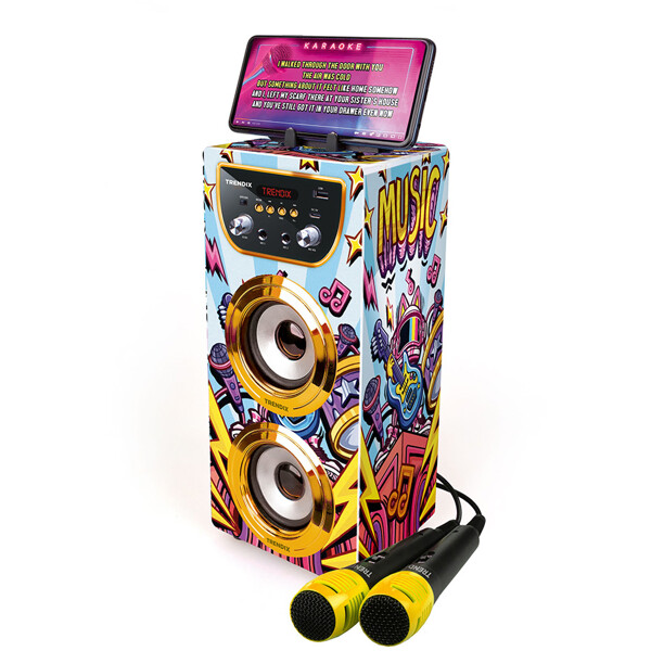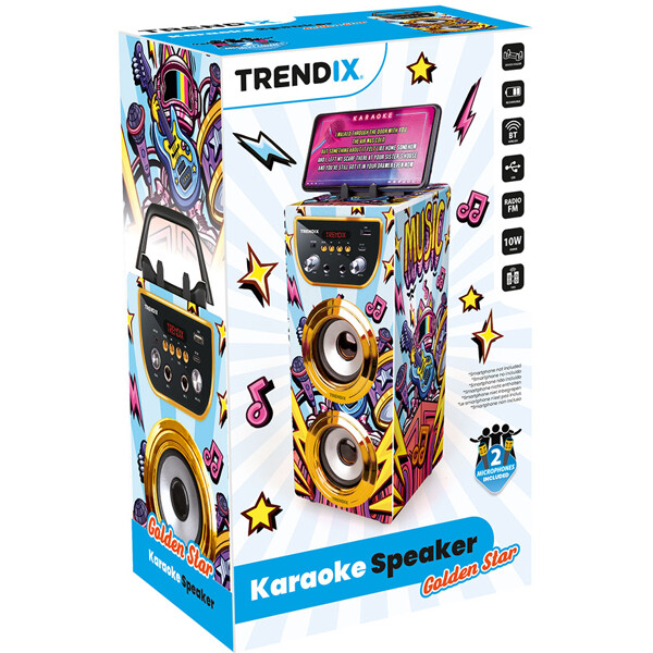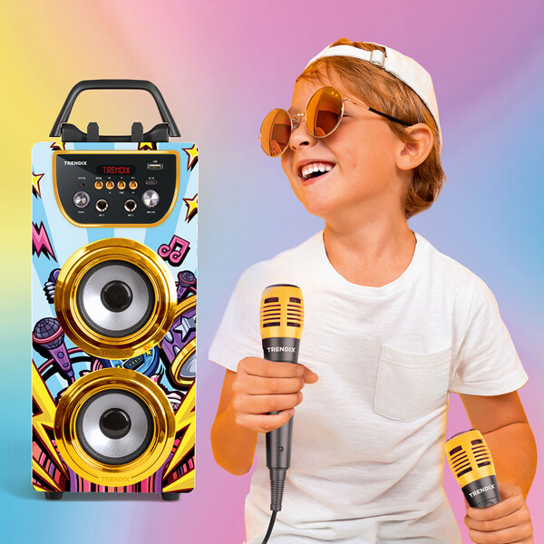 Bereit für Lachen, Gesang und Showtime? Mit der Trendix Karaoke Maschine bekommt die ganze Familie eine lustige Aktivität, um sich zu versammeln – perfekt für den Freitagabend, Kindergeburtstage oder regnerische Tage drinnen!Funktionen, die Kinder (und Erwachsene!) lieben:Zwei Mikrofone – singe Duette mit Geschwistern, Freunden oder Eltern!10W Lautsprecher – klarer und kraftvoller Klang, der den Raum füllt.Bluetooth-Verbindung – spiele eure Lieblingslieder direkt vom Handy oder Tablet ab.FM-Radio – höre eure Lieblingssendungen direkt in der Maschine.Echo-Effekt – verleihe dem Gesang einen professionellen und lustigen Touch.Verbinde mehrere Geräte – für noch größeren Klang und mehr Mitsänger!Telefonhalterung – perfekt, um Songtexte oder Playlists direkt vom Bildschirm zu verfolgen.Tragbar mit Griff – leicht zwischen Kinderzimmer, Wohnzimmer oder zu Oma und Opa mitzunehmen.Laden mit USB-C – praktisch, schnell und kompatibel mit heutigen Ladegeräten.Die Trendix Karaoke Maschine ist einfach zu bedienen, robust genug für kleine Hände und voller Musikfreude. Egal ob kleine Stars oder die ganze Familienband auftreten – mit Trendix wird jeder Tag ein bisschen festlicher!