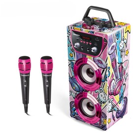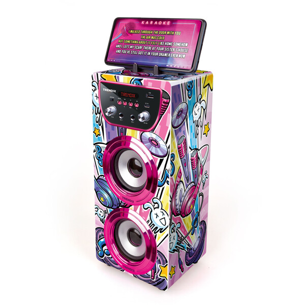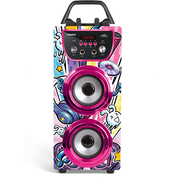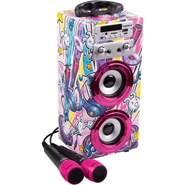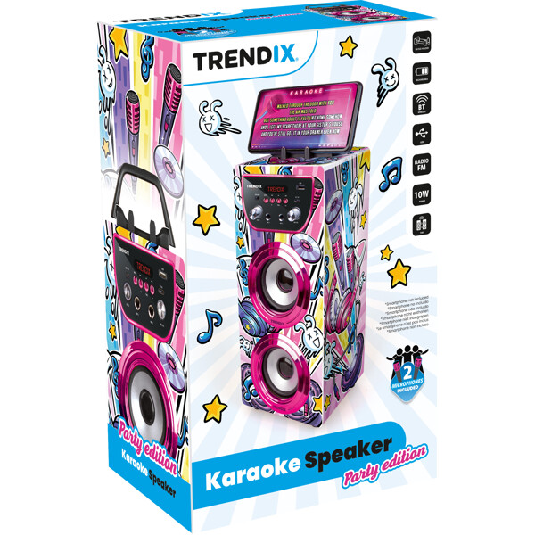 Bereit für Lachen, Gesang und Showtime? Mit der Trendix Karaoke Maschine bekommt die ganze Familie eine lustige Aktivität, um sich zu versammeln – perfekt für den Freitagabend, Kindergeburtstage oder regnerische Tage drinnen!Funktionen, die Kinder (und Erwachsene!) lieben:Zwei Mikrofone – singe Duette mit Geschwistern, Freunden oder Eltern!10W Lautsprecher – klarer und kraftvoller Klang, der den Raum füllt.Bluetooth-Verbindung – spiele eure Lieblingslieder direkt vom Handy oder Tablet ab.FM-Radio – höre eure Lieblingssendungen direkt in der Maschine.Echo-Effekt – verleihe dem Gesang einen professionellen und lustigen Touch.Verbinde mehrere Geräte – für noch größeren Klang und mehr Mitsänger!Telefonhalterung – perfekt, um Songtexte oder Playlists direkt vom Bildschirm zu verfolgen.Tragbar mit Griff – leicht zwischen Kinderzimmer, Wohnzimmer oder zu Oma und Opa mitzunehmen.Laden mit USB-C – praktisch, schnell und kompatibel mit heutigen Ladegeräten.Die Trendix Karaoke Maschine ist einfach zu bedienen, robust genug für kleine Hände und voller Musikfreude. Egal ob kleine Stars oder die ganze Familienband auftreten – mit Trendix wird jeder Tag ein bisschen festlicher!