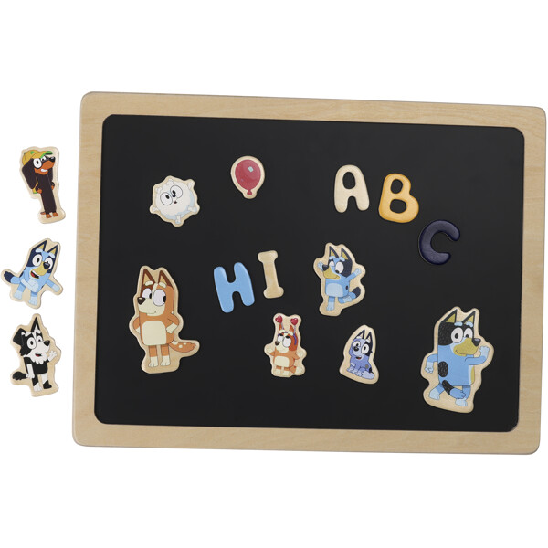 Eine zweiseitige Magnettafel von Bluey! Lassen Sie die Kinder auf der schwarzen Seite mit den Buchstaben Wörter bilden und auf der anderen Seite mit den Figuren spielen. Jetzt können die Kinder das Buchstabieren lernen, während sie Spaß in Blueys Welt haben! Welche von Blueys Freunden kommen heute in den Garten zu Besuch? Jede Menge Spielspaß mit Buchstaben und beliebten Charakteren aus Blueys Welt!