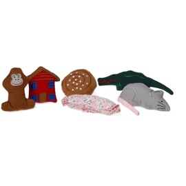 Im ersten Nachfüllbeutel für den Liederbeutel von Oskar & Ellen sind blumige Fleischwurst, Affe, Haus, Ratte, Krokodil und Zimtschnecke enthalten.