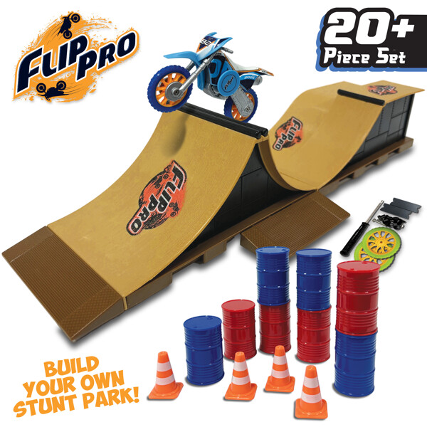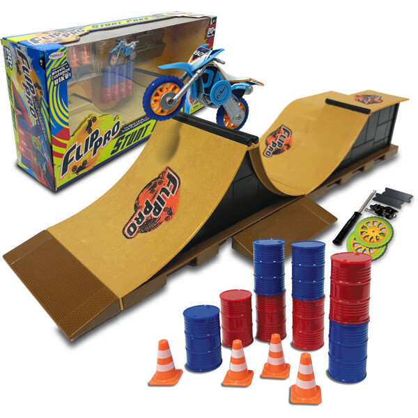 Das Flip Pro Spin Bike ist gemacht für wilde Stunts, coole Flips und Nonstop-Action mit Stahlkugellagern für blitzschnelle Spins und präzise Kontrolle. Neben einem Flip Pro Bike enthält dieses Stunt Park-Set auch austauschbare Räder, 2 Rampen, 8 Fässer und 4 Kegel, sodass du alles hast, was du brauchst, um deine eigene Stuntbahn zu bauen und das Spiel auf die nächste Stufe zu heben.