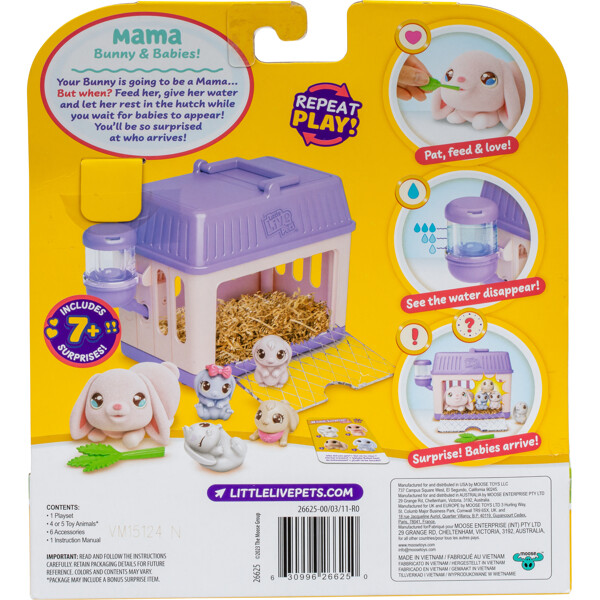 Little Live Pets Mama Surprise Minis hebt das Spielen mit deinem Haustier auf ein ganz neues Niveau. Erlebe die Freude, dich um deine Mama-Kaninchen zu kümmern und zu sehen, wie sie 2, 3 oder 4 Baby-Kaninchen bekommt!