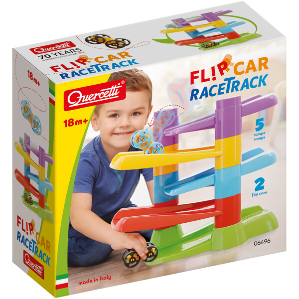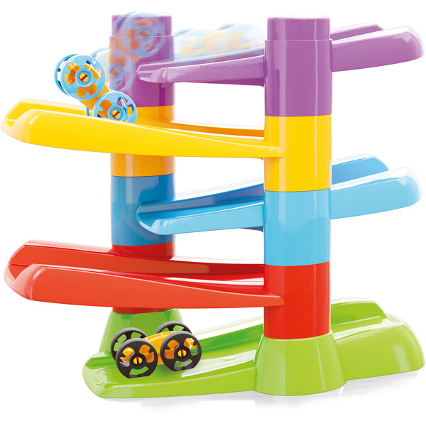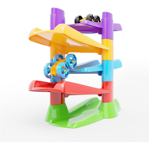 Rasante Autorennbahn, bei der sich die Autos an jeder Rampe selbst wenden. Baue die Bahn zusammen und lass das Rennen beginnen!
