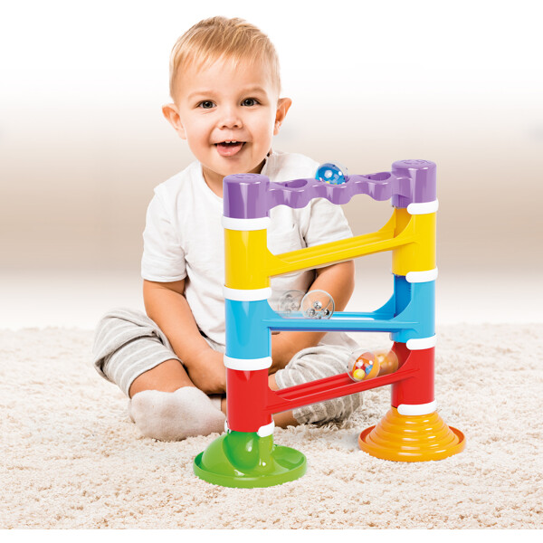 Klassische Kugelbahn mit einem extra lustigen Element - drei große Klangkugeln, die spannende Effekte erzeugen, wenn sie rollen!