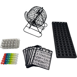Enthalten: Bingomaschine, Bingokugeln, Karten, Kugelablage und farbige Spielsteine.