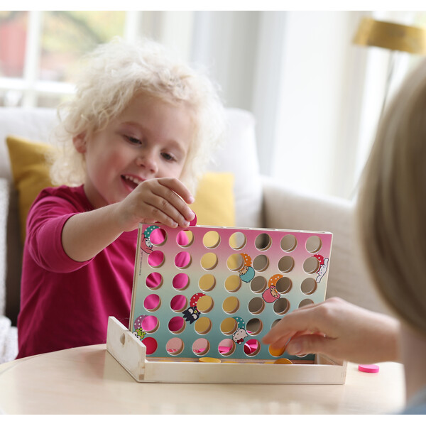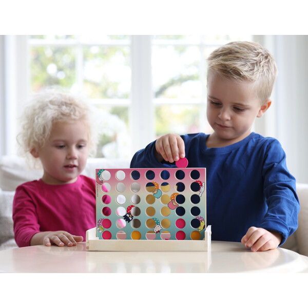 Lustiges Spiel für Kinder von Hello Kitty! Bringe 4 deiner Farbe in eine Reihe, während du versuchst, den Gegner daran zu hindern, dasselbe zu tun. Das Kinderspiel ist aus Holz und enthält 1 Spielbrett, 21 rosa Spielsteine, 21 gelbe Spielsteine, eine Aufbewahrung für die Spielsteine und die Spielregeln. Ein lustiges Spiel für Kinder, das der ganzen Familie spielerischen Spaß bietet! Die Spielregeln findest du in der Verpackung.