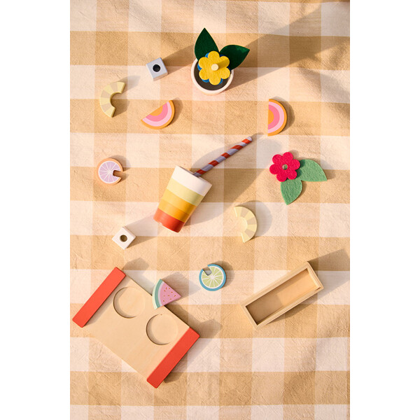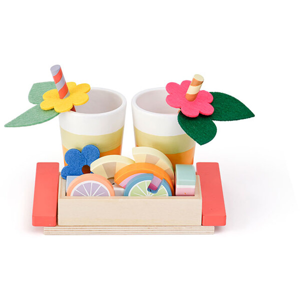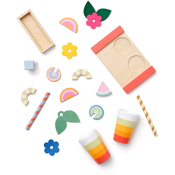 Das Set enthält ein Tablett, zwei bunte Gläser, Eiswürfel, Fruchtstücke, drei Strohhalme und Dekorationen aus Filz. Ein Holzbehälter, der perfekt auf das Tablett passt, hält alle Teile zusammen und bereit zum Spielen. Jetzt kann die Party beginnen!